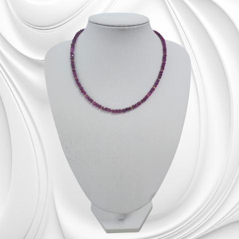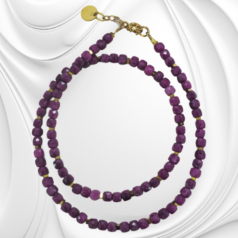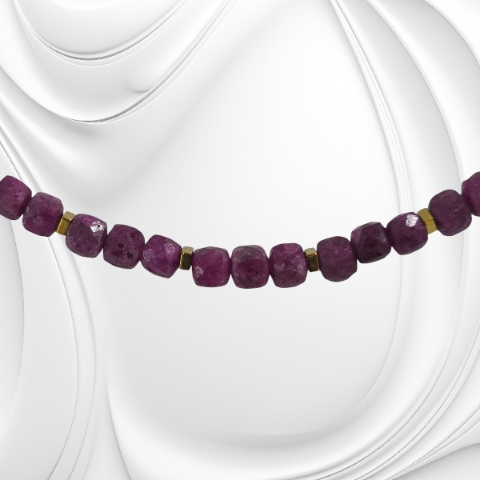 Ręcznie wykonany naszyjnik z kostek fasetowanego rubinu z przekładkami złoconego hematytu to biżuteria, która łączy elegancję z nowoczesnym stylem. Rubin zachwyca głębokim kolorem i szlachetnym blaskiem, a złocony hematyt nadaje całości wyjątkowej, subtelnej świetlistości.
