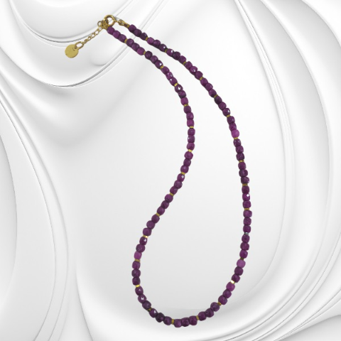 Każdy naszyjnik powstaje w procesie ręcznego wykonania, co sprawia, że jest unikatowy. Precyzyjne fasetowanie rubinu wydobywa jego naturalny blask, a złocony hematyt wprowadza nowoczesny akcent.