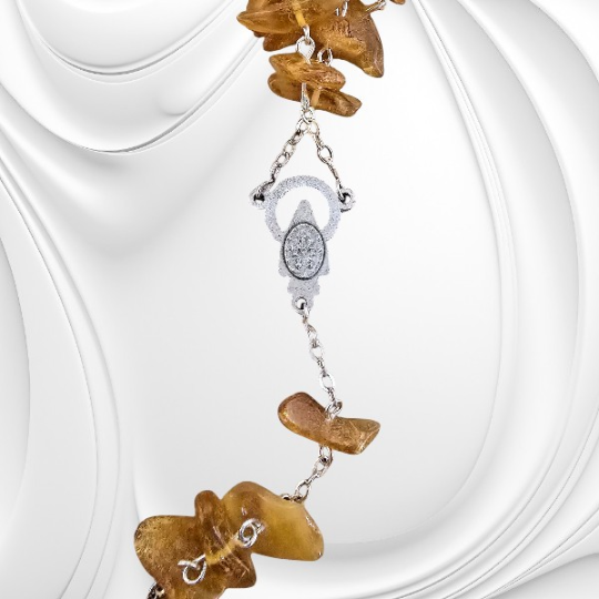 Różaniec z bursztynu bałtyckiego i stali chirurgicznej zachwyca ciepłym blaskiem naturalnych kamieni oraz solidnym, nowoczesnym wykończeniem, tworząc wyjątkowy przedmiot o głębokim znaczeniu. Każda kulka bursztynu wyróżnia się indywidualnym odcieniem – od jasnego miodu po głęboki koniak – oraz subtelnymi inkluzjami, które świadczą o jego naturalnym pochodzeniu. Dzięki temu różaniec z naturalnego bursztynu bałtyckiego jest nie tylko przedmiotem modlitwy, lecz także unikatową formą biżuterii religijnej.