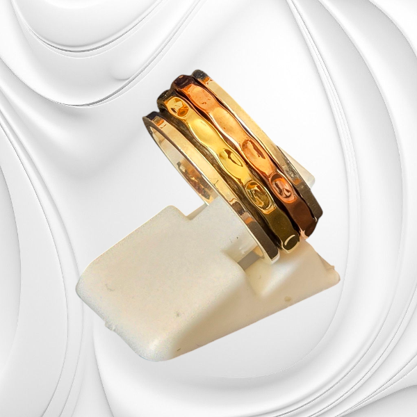 Elegancka obrączka srebrna wykonana z najwyższej próby srebra 925, wolny od niklu, co zapewnia komfort noszenia bez ryzyka uczuleń. Dodatkowo pokryty trzema warstwami szlachetnego rodu oraz 3 mikronami 24-karatowego złota w dwóch kolorach na elementach ruchomych, co nadaje mu subtelną elegancję i wyjątkowy blask. Biżuteria łączy nowoczesny design z ponadczasowym stylem.