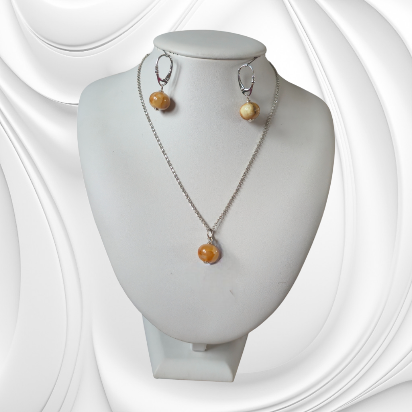 Elegancki srebrny komplet: kolczyki i zawieszka z kulek bursztynu. Naturalna biżuteria, idealna na prezent.