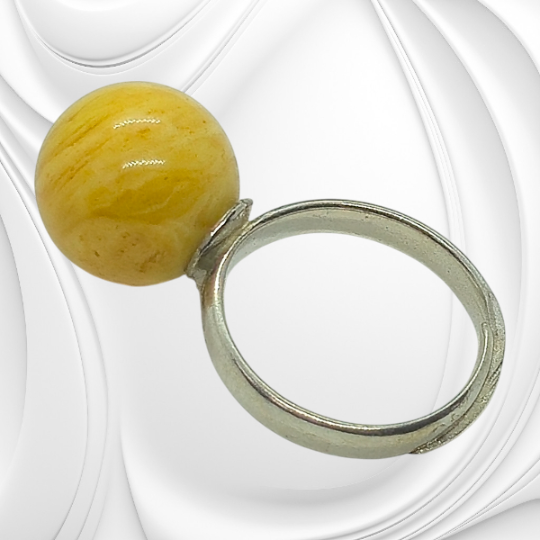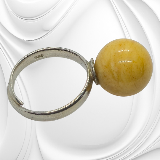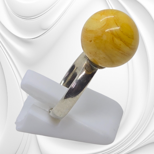 Srebrny pierścionek z kulką mlecznego bursztynu – regulowana elegancja