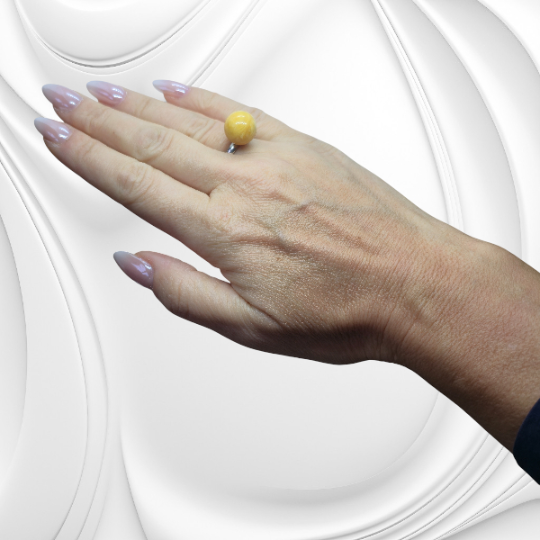 Odkryj srebrny pierścionek z kulką mlecznego bursztynu. Regulowany, delikatny i pełen naturalnego uroku.
