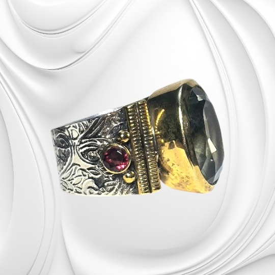 Elegancki srebrny pierścionek z szeroką obrączką, dużym topazem i dwoma granatami. Wyjątkowa biżuteria z naturalnymi kamieniami.