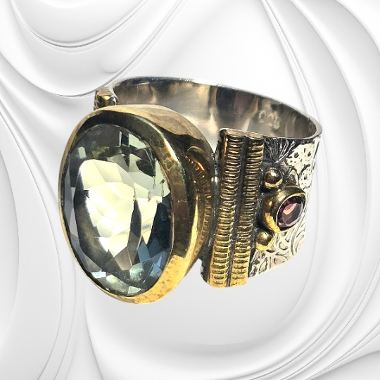Srebrny pierścionek z szeroką obrączką z dużym oczkiem z topazem i dwoma małymi granatami