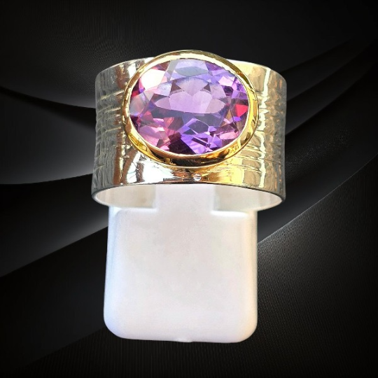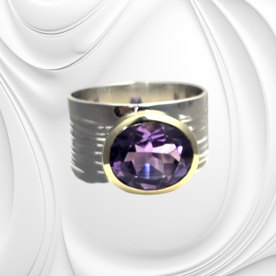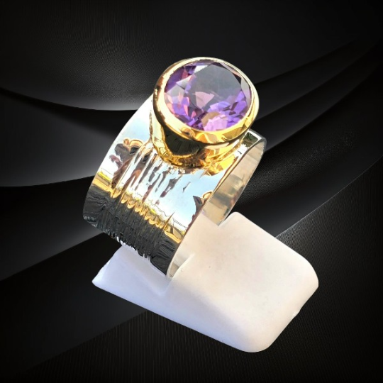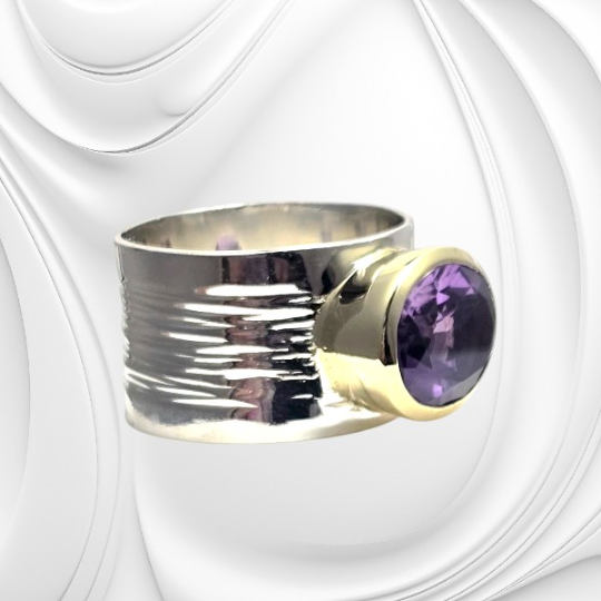 Srebrny pierścionek z szeroką obrączką i ametystem wykonany ze srebra próby 925. Naturalny ametyst o intensywnym fioletowym kolorze i eleganckim charakterze.