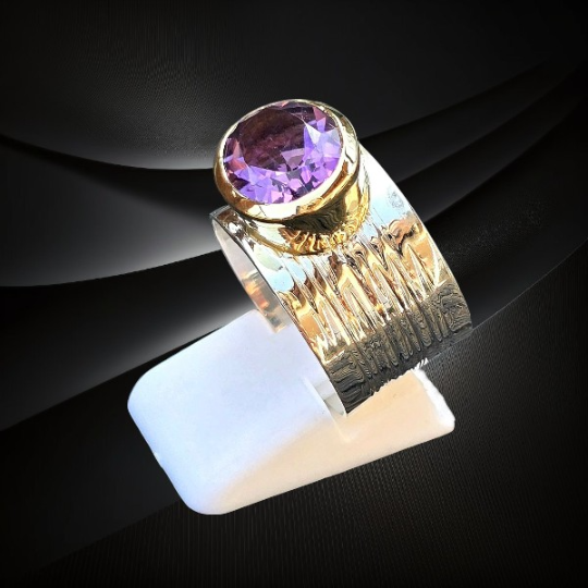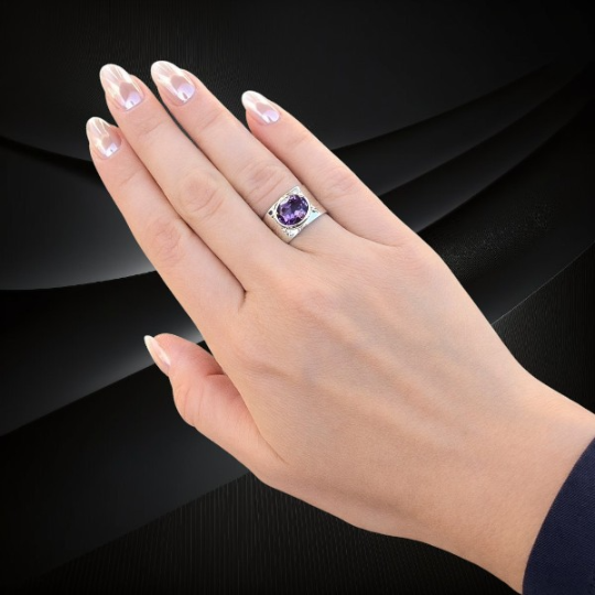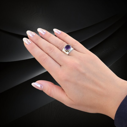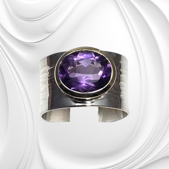 Ametyst od wieków uznawany był za kamień królewski i symbol harmonii. W starożytności zdobił królewskie ozdoby oraz biżuterię arystokracji. Srebrny pierścionek z szeroką obrączką i ametystem to połączenie naturalnego piękna kamienia z elegancją srebrnej biżuterii. Jego głęboki kolor i wyjątkowa forma sprawiają, że staje się biżuterią, która przyciąga spojrzenia i podkreśla indywidualny styl.