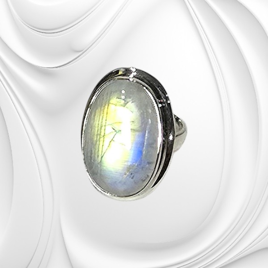 Srebrny regulowany pierścionek z kamieniem księżycowym wykonany ze srebra próby 925. Naturalny kamień o subtelnym połysku i regulowany rozmiar. Elegancka biżuteria na prezent.