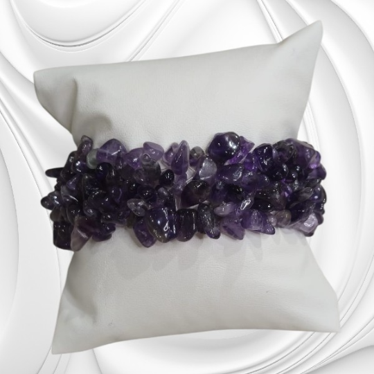 Szeroka bransoletka z ametystów to efektowna biżuteria z kamieni naturalnych o głębokim, fioletowym kolorze. Ta bransoletka z ametystu zachwyca intensywną barwą i zdecydowaną formą. Naturalne kamienie ametystu tworzą szeroką kompozycję, która pięknie podkreśla nadgarstek i nadaje stylizacji charakteru. Każdy kamień ma unikalną strukturę oraz subtelne różnice w odcieniu fioletu, dzięki czemu bransoletka jest niepowtarzalna i pełna naturalnego uroku.