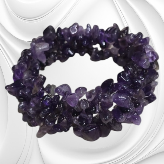 Szeroka bransoletka z kamieni naturalnych ametystów na gumce jubilerskiej. Wyrazista, wygodna biżuteria o głębokiej barwie.