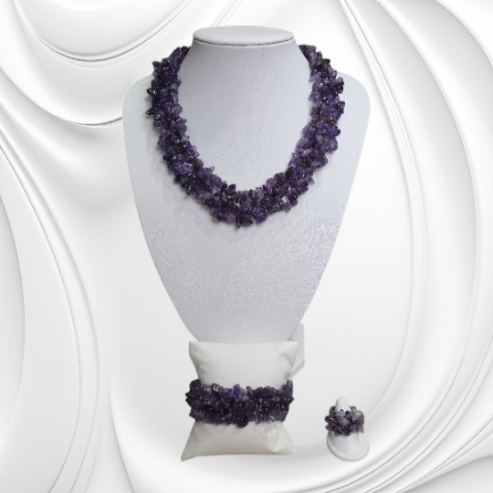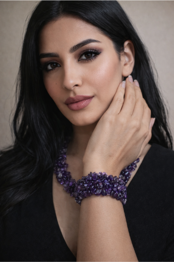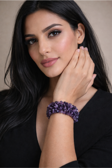 To biżuteria, która nie potrzebuje dodatkowych ozdób – sama w sobie stanowi mocny, elegancki akcent. Ametyst od wieków uznawany jest za kamień równowagi, intuicji i wyciszenia. Jego głęboki fiolet kojarzy się z elegancją i wewnętrzną siłą. Szeroka bransoletka z ametystów łączy naturalne piękno kamieni z symboliką spokoju, tworząc biżuterię, która jest nie tylko ozdobą, ale także osobistym talizmanem.