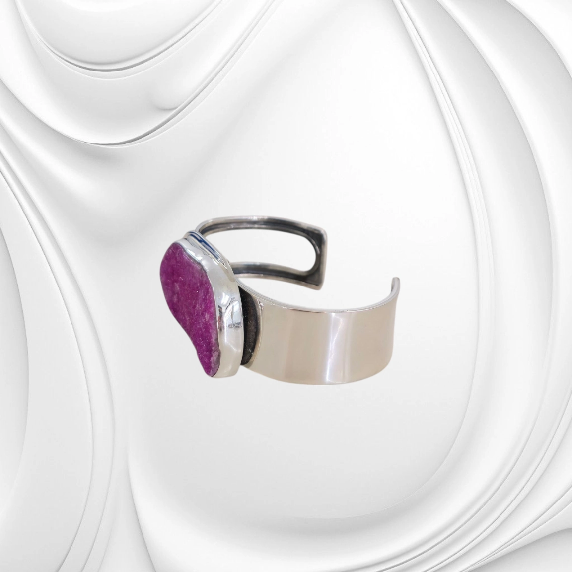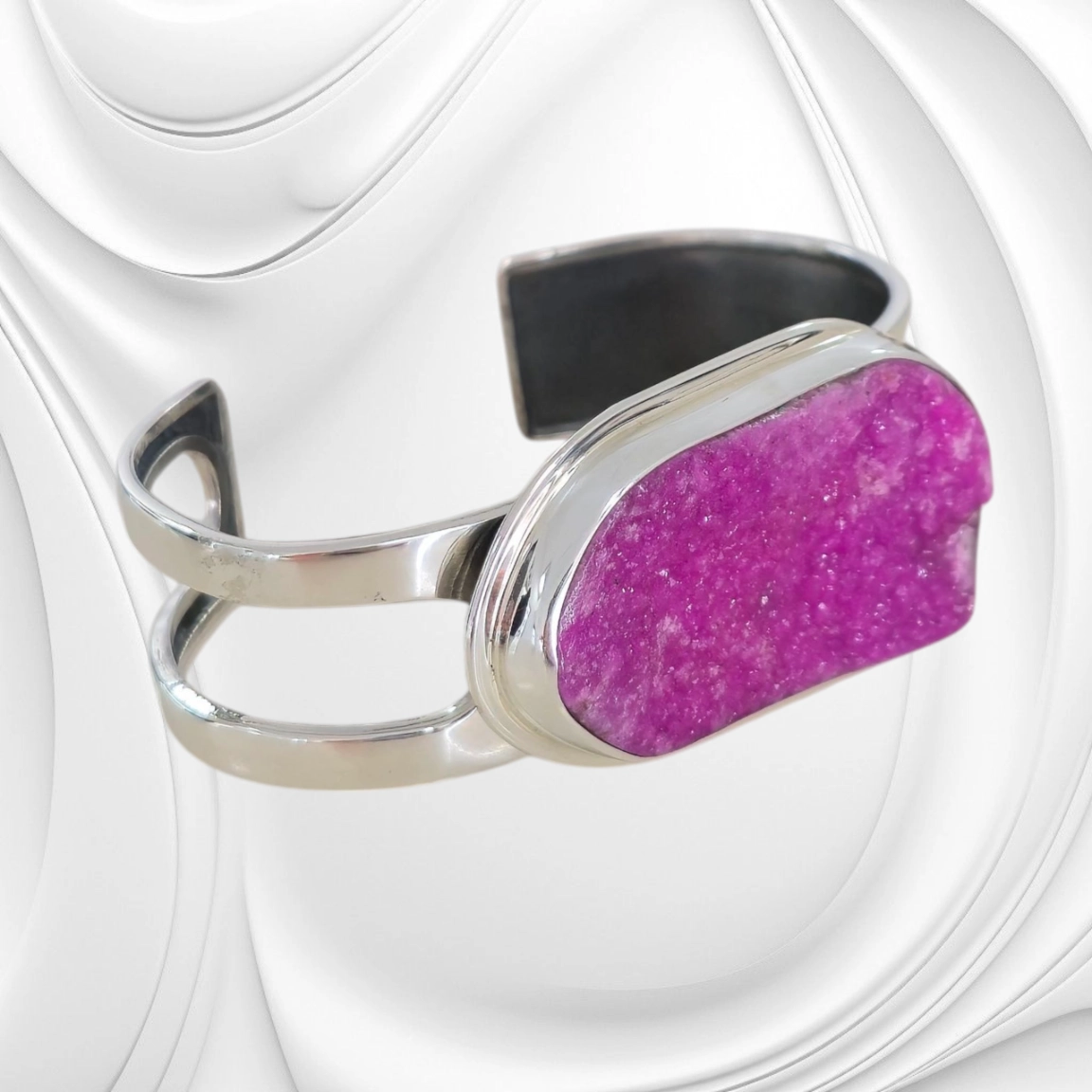 Każda kobieta ma w sobie moc – czasem delikatną, czasem wyrazistą. Ta bransoletka z fuksjowym kalcytem kobaltowym została stworzona, by tę siłę podkreślać. Inspirowana kolorami natury i kobiecą niezależnością, powstała w rękach artysty, który nadał surowemu kamieniowi elegancką formę. Fuksjowy odcień kalcytu to nie tylko barwa – to emocja, pasja i energia zamknięta w srebrze.