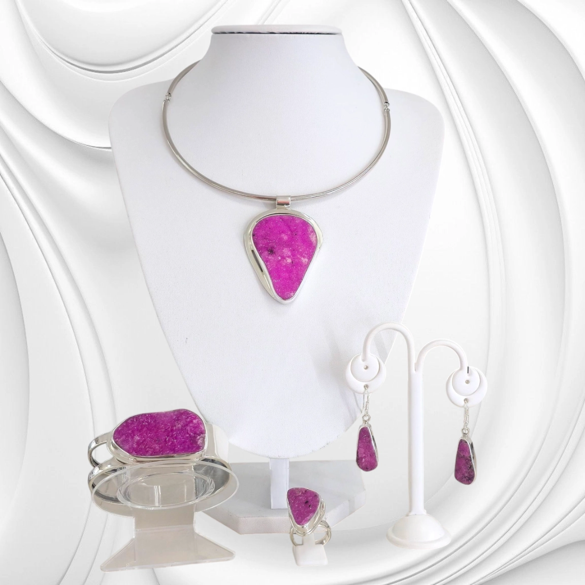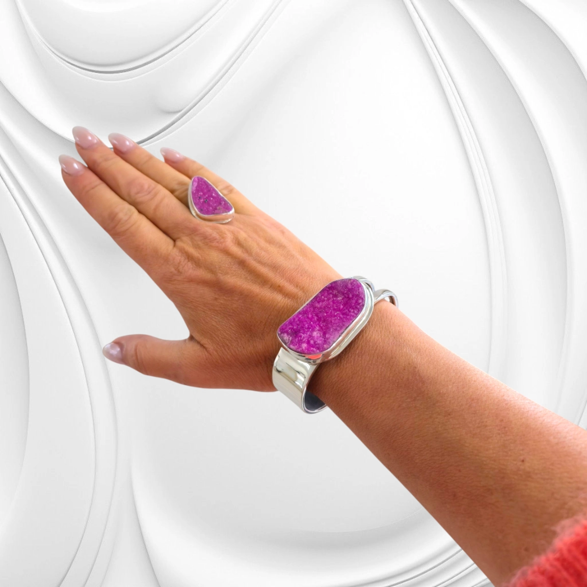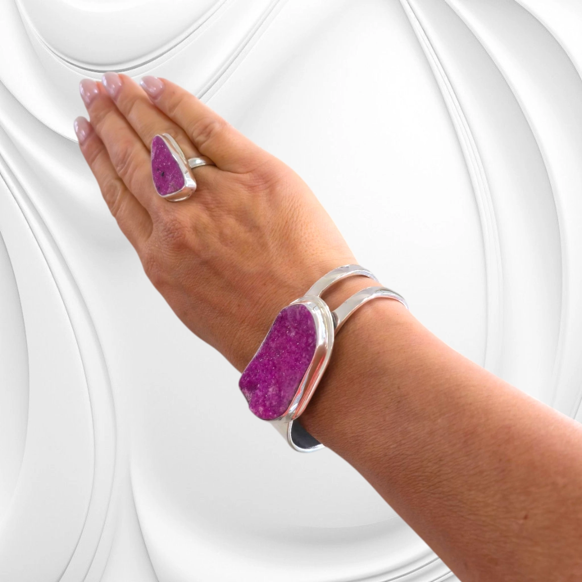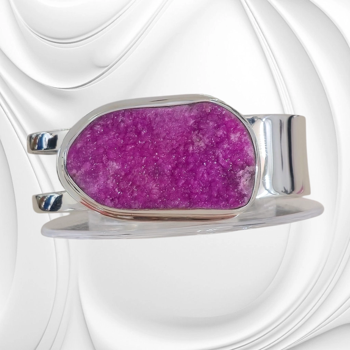 Szeroka srebrna bransoletka z fuksjowym kalcytem kobaltowym – ręcznie wykonana, artystyczna biżuteria. Stwórz komplet z zawieszką, kolczykami i pierścionkiem.
