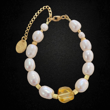 Bransoletka z pereł i bursztynu to wyjątkowe połączenie naturalnego piękna i klasycznej elegancji. Delikatne perły kontrastują z bryłkami polerowanego bursztynu w odcieniu słonecznym, tworząc niepowtarzalną kompozycję. Srebrne przekładki pokryte złoceniem oraz zapięcie i przedłużka ze złoconego srebra nadają całości luksusowego charakteru.