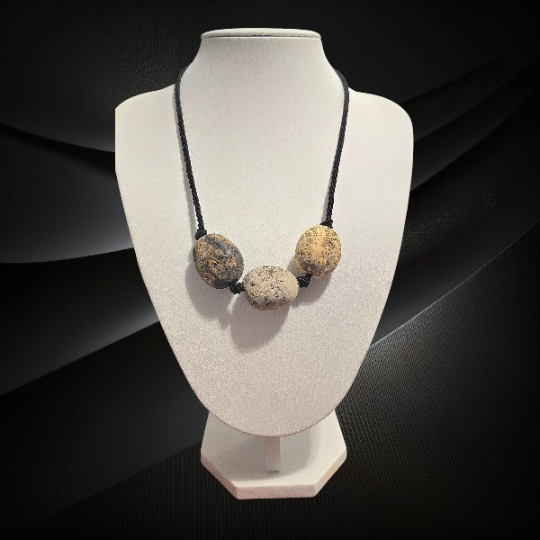 Naszyjnik został wykonany z trzech brył naturalnego, niepolerowanego bałtyckiego bursztynu o nieregularnym kształcie przypominającym fasolki. Każdy element został starannie nawleczony na wytrzymały sznurek, który podkreśla surową estetykę projektu. Zapięcie ze stali chirurgicznej zapewnia trwałość, odporność na korozję oraz komfort użytkowania. To propozycja dla osób ceniących naturalne materiały, minimalistyczny design i unikatowy charakter biżuterii.