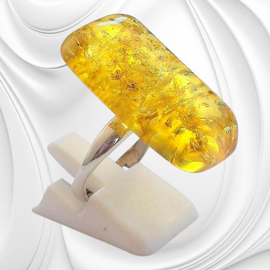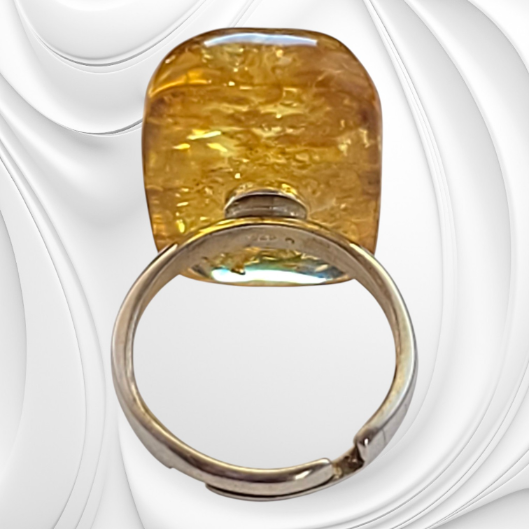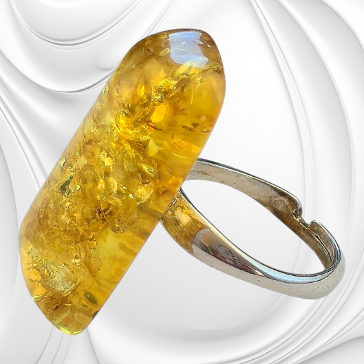 Wyjątkowy pierścionek z polerowanego bursztynu bałtyckiego na srebrnej regulowanej obrączce. Bursztyn i srebro 925 tworzą ponadczasową biżuterię.