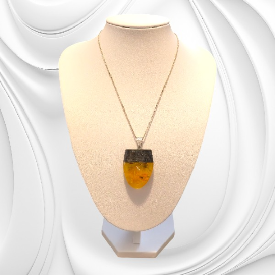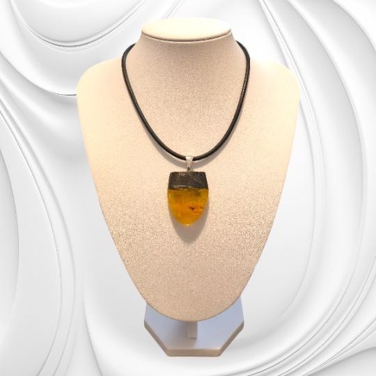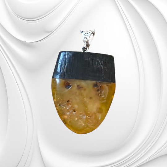 Zawieszka została wykonana z naturalnego bursztynu bałtyckiego, którego ciepła barwa i delikatne inkluzje przypominają o morskim pochodzeniu kamienia oraz jego wielomilionowej historii. Towarzyszy mu czarny dąb – drewno wydobywane z głębi ziemi, nazywane często „polskim hebanem”, cenione za swoją ciemną barwę i trwałość. Połączenie tych dwóch naturalnych materiałów tworzy harmonijną całość, w której światło bursztynu pięknie kontrastuje z głębią czarnego drewna.
